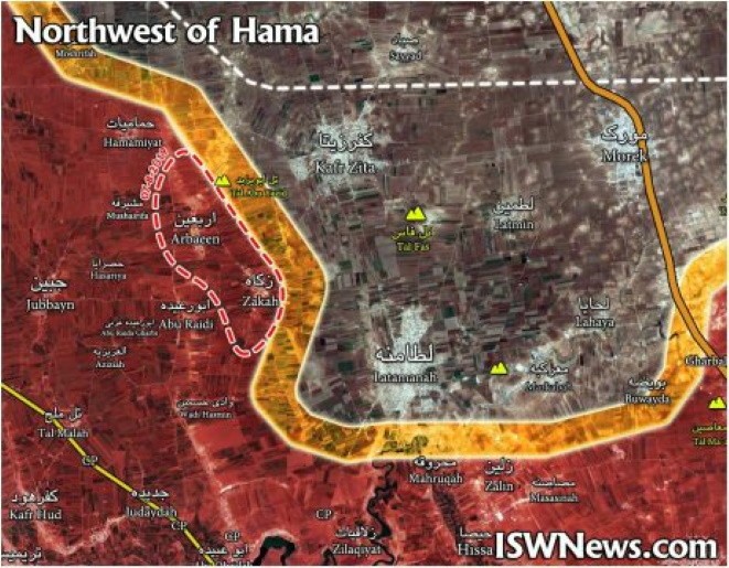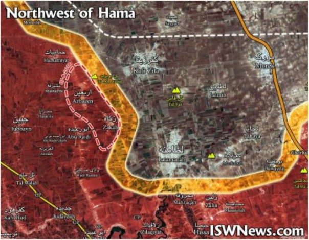 По некоторым данным, правительственные силы перешли к штурму населенного пункта Кафр-Зета, который долгое время представлял собой важный оплот террористов. В случае успеха операции в ближайшие несколько дней правительственные силы смогут выйти к окраинам Хан-Шейхуна и Мурека, отрезав «Аль-Латаминский выступ» фронта в Хаме. Источник