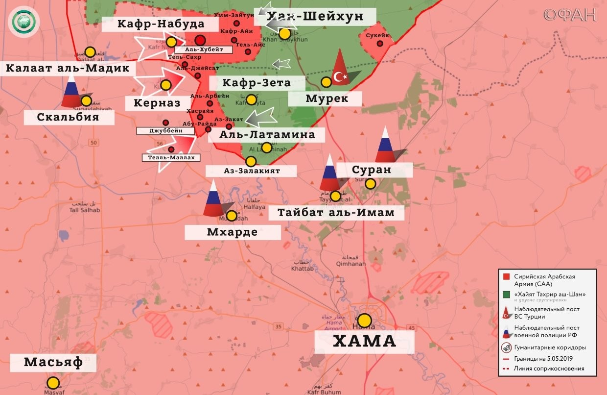 В то же время перестрелки имели место в северном Хан-Шейхуне, который де-факто остался спорной территорией между армией и Хаят Тахрир аш-Шам*. Боевики также нанесли несколько ударов с помощью ПТРК по позициям армии к северу от города.