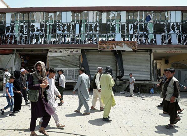 Люди проходят мимо здания с выбитыми окнами на месте взрыва в Кабуле, Афганистан. 7 августа 2019