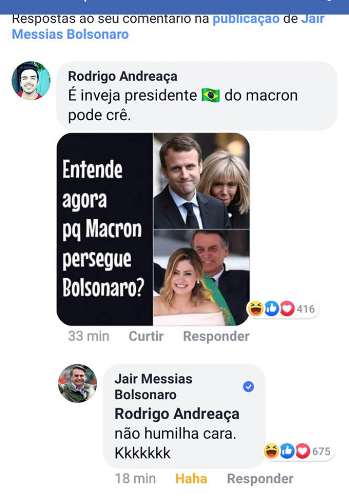 Один из первых комментариев под постом оставил сам президент Болсонару. "Не унижай этого типа, хахахаха", - поглумился он.