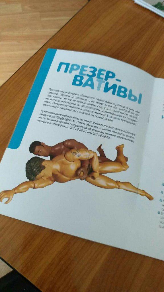 В брошюрах излагаются основы профилактики ВИЧ-инфекций при однополых отношениях между мужчинами. Помимо текстовой информации они содержат очень откровенные картинки об использовании презервативов при сексуальном контакте между парнями.