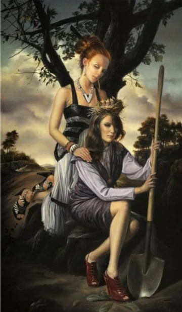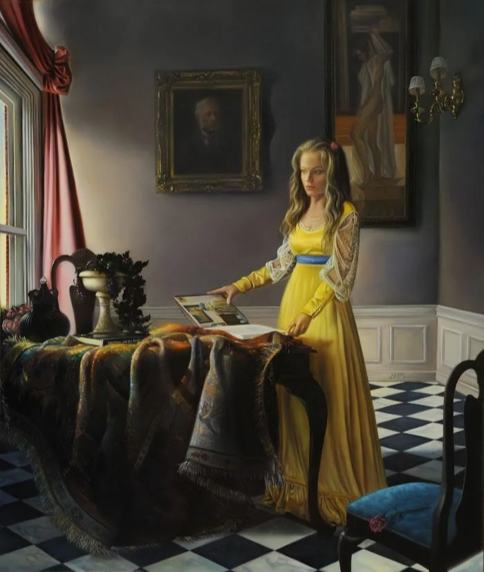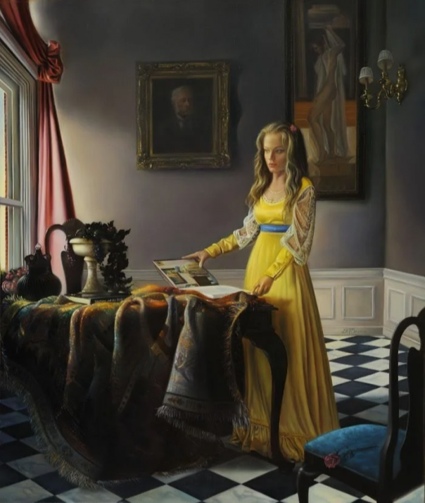 Часто художник использует работы голландцев семнадцатого века, вот так например в картине Лицо света художник поместил фигуру явно современную женщины в старинном платье с современным альбомом на столе