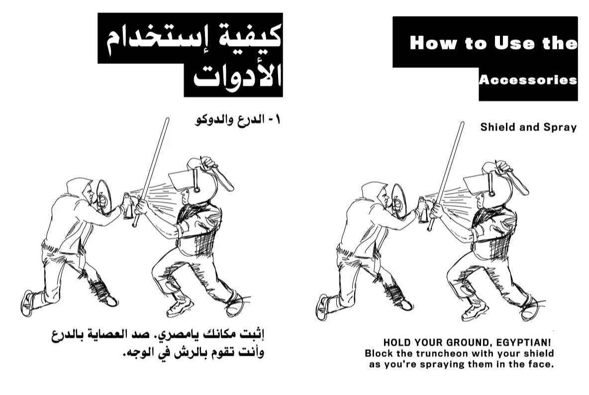 А вот эта особо интересна, ибо всплыл язык оригинала. На рисунке учат как правильно бороться за демократию подручными средствами.