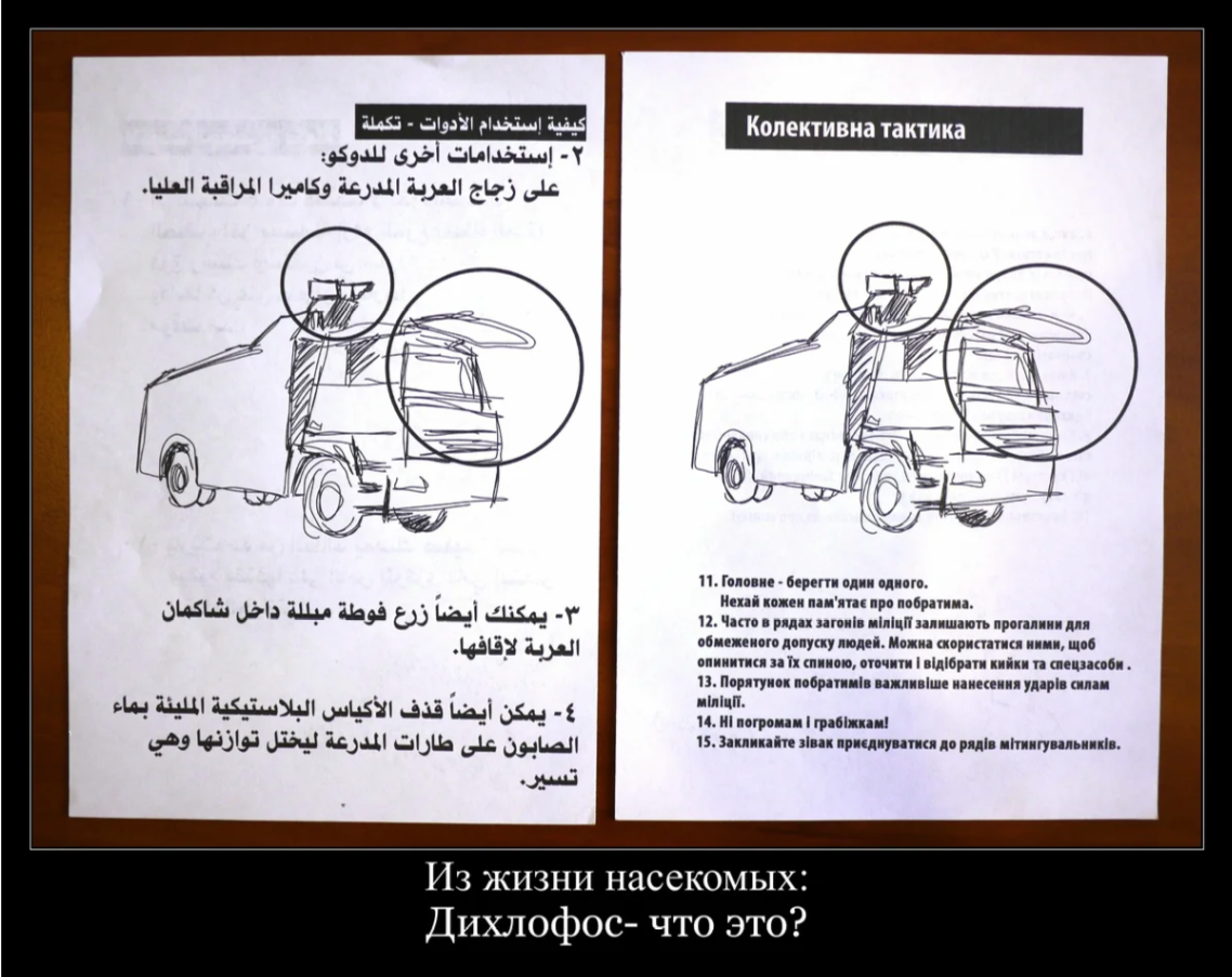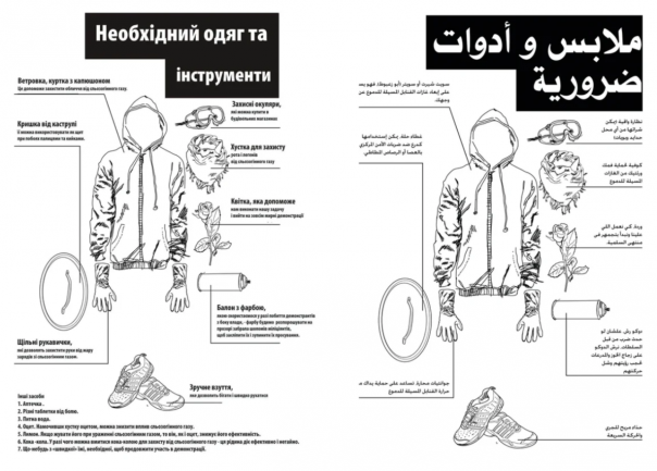 Вот я всё время думал, чего это они все так однотипно одеты. А всё просто: бумажка подскажет. Особенно про цветочек понравилось - типа, мы же за мир :) Балончик с краской, правда, нужен не для рисования котиков, а для противостояния с Беркутом. Ну и крышка от кастрюли, куда ж без неё (я-то думал, что это местное творчество, ан нет).