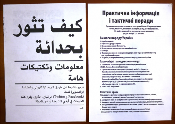Когда в очередной раз слышу о том, что "это народ вышел свергать власть", то всё время становится интересно: а кто их научил скоординированной деятельности, как одеваться, что кричать, куда бежать. А для этого добрые дяди подготавливают методички, чтобы борец с "Злочинной владой" знал, что делать.