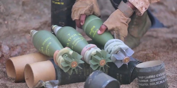 Скриншот из пропагандистского ролика ИГ. Миномётные снаряды 82-мм M74 HE, серия 04/18 от сербского оружейного завода «Крусик», а также миномётные снаряды из Боснии и Герцеговины