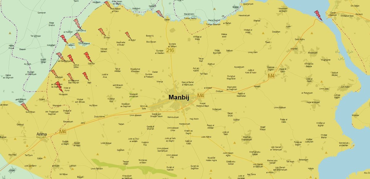 Населенные пункты, находящиеся в районе Манбиджа, где было отмечено развертывание подразделений Сирийской Арабской Армии (САА):