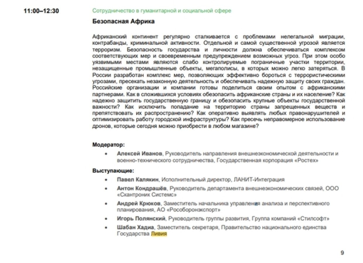На форуме 24 октября состоится дискуссия «Безопасная Африка», в ходе которой будут обсуждаться вопросы сотрудничества в гуманитарной и социальной сферах, а также проблемы нелегальной миграции и растущей криминальной активности. Ожидается, что выступать будет и замсекретаря ПНС Шабан Хадиа, представляющий интерес для спецслужб и правоохранителей многих стран. Заинтересованность вызвана его неоднократными связами с террористами.