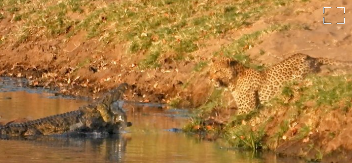 В то время как крокодил наслаждался трапезой, на берегу показался леопард. Почувствовав запах свежего мяса, он устремился к воде и попытался схватить тушу. Как и крокодил, этот хищник также не брезгует падалью и нередко отбирает чужую добычу.