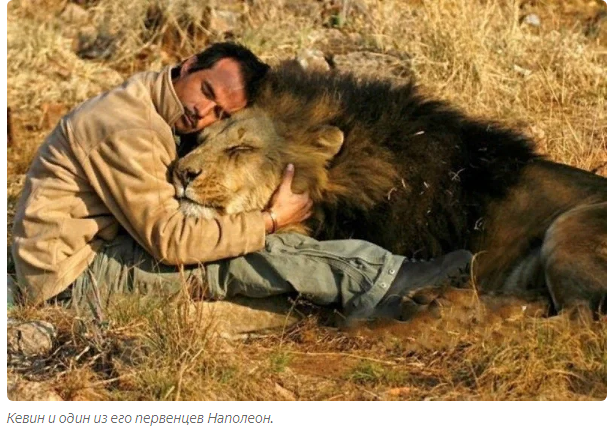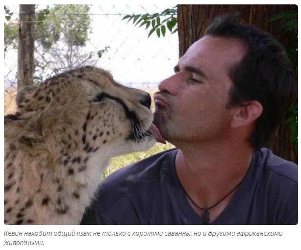 Хищники видят в Кевине не диктатора с палкой и хлыстом, а близкого друга. «Кровожадные» звери относятся к человеку, как к члену своей стаи. Он спит рядом со львами и тиграми, ест и играет вместе с ними. Гиены всегда могут вызвать Кевина как такси и поехать на сходку падальщиков, а львы не откажутся от настоящих мужыцких почесулек животика.