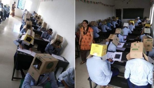 Фотографии учащихся, сидящих в классе с картонными коробками на голове, мгновенно разлетелись по социальным сетям.