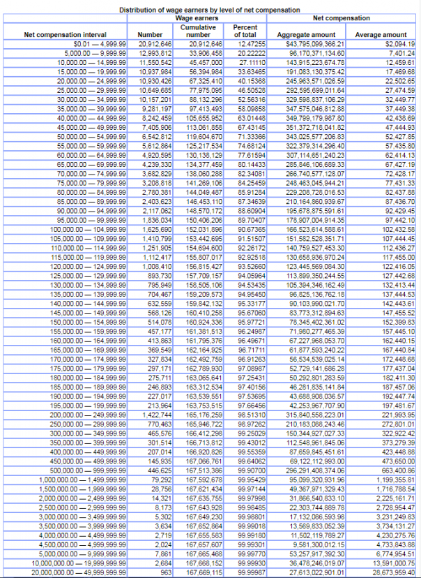 Тут мы видим, в частности, что каждый восьмой американец имеет зарплату (в год до вычета налогов) менее $5000 (в среднем $2094), а каждый второй (52%) имеет менее $35000 (в среднем $15239).