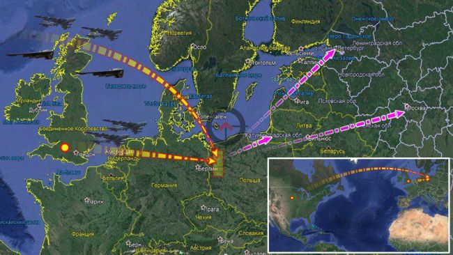 «Накануне, 28 октября, в ночь по московскому времени четыре бомбардировщика (два В-52Н Stratofortress и два «невидимки» Northrop B-2А Spirit) покинули авиабазу «Эллсворт» в штате Южная Дакота, выполнили перелёт через Атлантику и, дойдя до рубежа применения оружия над западной частью Польши, повернули на обратный курс. При подходе к рубежу применения оружия почти синхронно с ними действовали и два В-52Н, которые вылетели с британской авиабазы «Фэрфорд», — сообщили авторы «Оперативной линии».