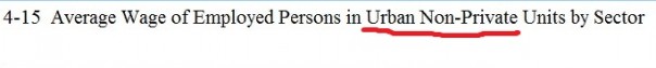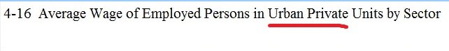 3) Самое важное. Средняя только среди urban non-private. Ключевая деталь даже не в том, что среди НЕ частных (так как чуть ниже посмотрим и среднюю по частным), а в том что только среди городских (urban) предприятий. Еще раз - только городских. То есть десятки (сотни?) миллионов наиболее бедных китайских наёмных работников (а это не только сельхозработники) работающих в сельской местности из расчёта исключены. Но это не претензия к Китайстату, они ведь честно сообщают об этом.