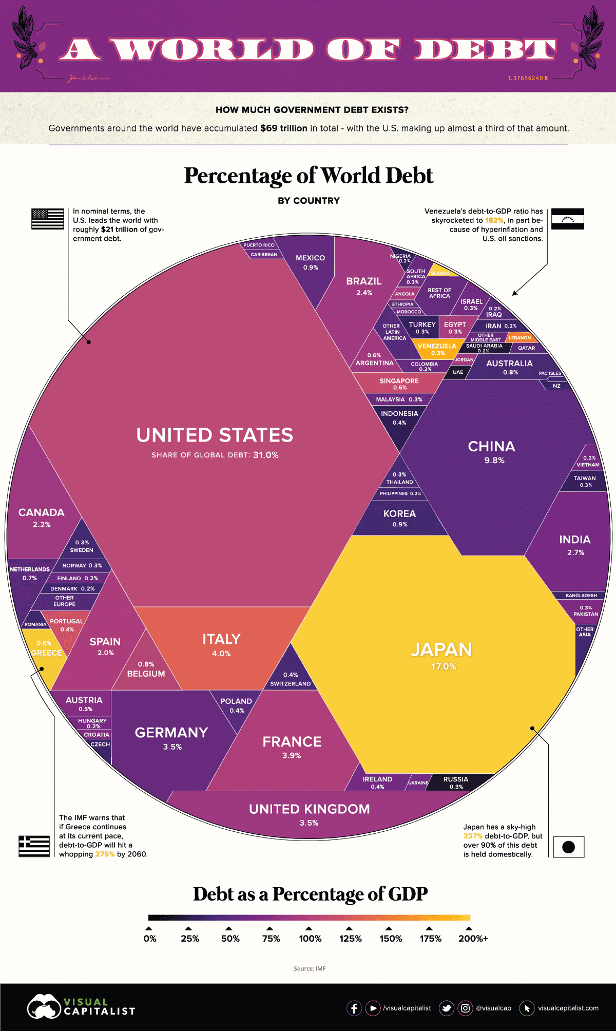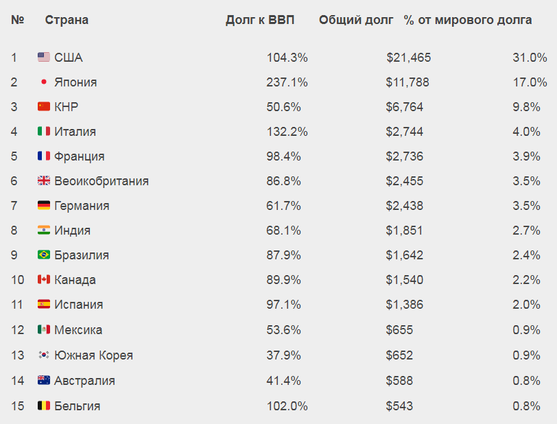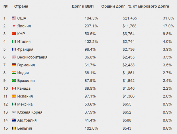 Также в приведенном выше списке выделяются Япония, у которой самое высокое отношение долга к ВВП (237,1 процента), и Китай, который только за последние два года увеличил государственный долг почти на 2 триллиона долларов. Между тем, среди европейских экономик самыми крупными должников с показателями, превышающими 100 процентов долга к ВВП, значатся Италия и Бельгия.