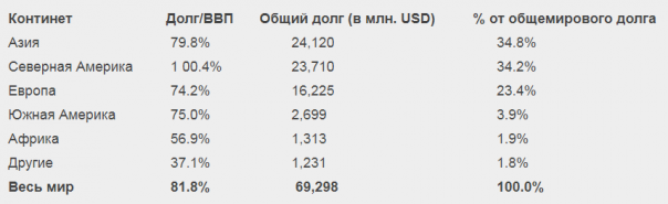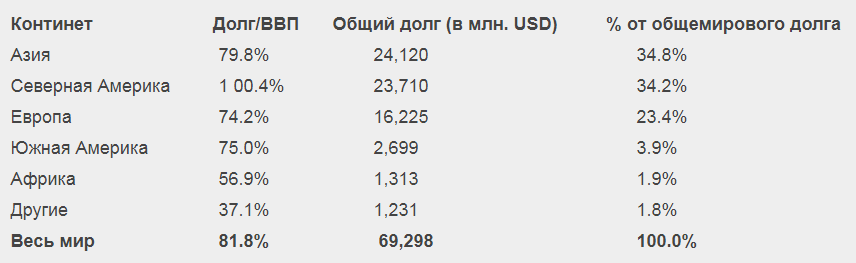 В абсолютном выражении более 90 процентов мирового долга сосредоточено в Северной Америке, Азиатско-Тихоокеанском регионе и Европе, в то время как на такие регионы, как Африка, Южная Америка и другие оставшиеся, приходится менее 10 процентов.