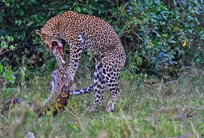 Питон изворачивался всем телом и кусал леопарда, чтобы тот прекратил или ослабил свои атаки, а пятнистый зверь в ответ использовал свои острые зубы и когти, ловкими прыжками пытаясь уйти от укусов змеи. В конце концов рептилия была побеждена и хищник, который тоже не избежал травм (сильнее всего пострадала передняя лапа), гордо сел рядом с поверженной жертвой.