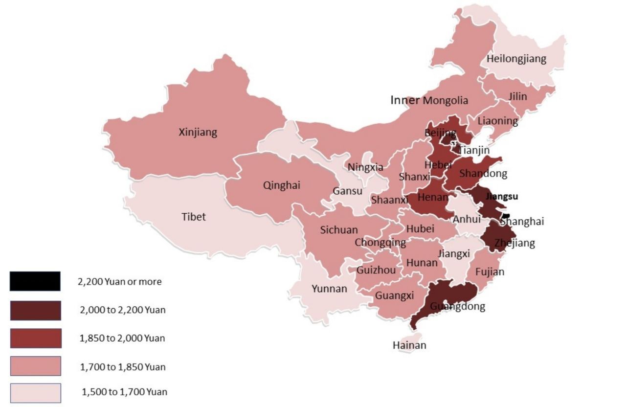 География минимальных зарплат. Смело умножайте на 10 по курсу, чтобы получить рубли. В итоге минималка в полуторамиллиардном Китае от 15.000 целковых. Чашка риса, говорите )))
