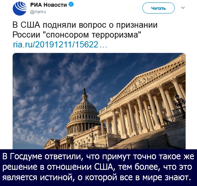 Ранее международный комитет сената США одобрил законопроект, который обязывает госсекретаря решить, надо ли объявить Россию спонсором терроризма. Сейчас в этот список входят Иран, Северная Корея, Сирия и Судан.
