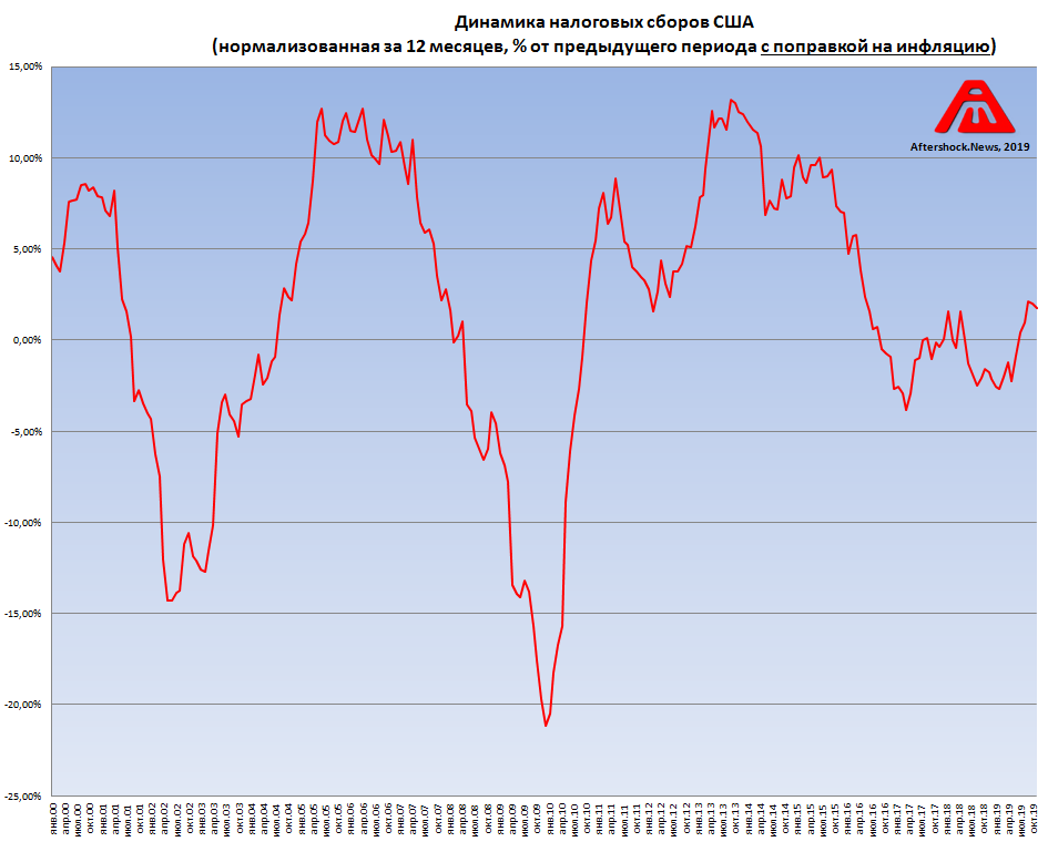 9. Динамика доходов бюджета США (нормализованная, с поправкой на инфляцию) - показатель был в положительной зоне лишь 8 из последних 39 месяцев, затяжная стагнация, хуже текущей она была лишь в разгаре обвала после 2008 года: