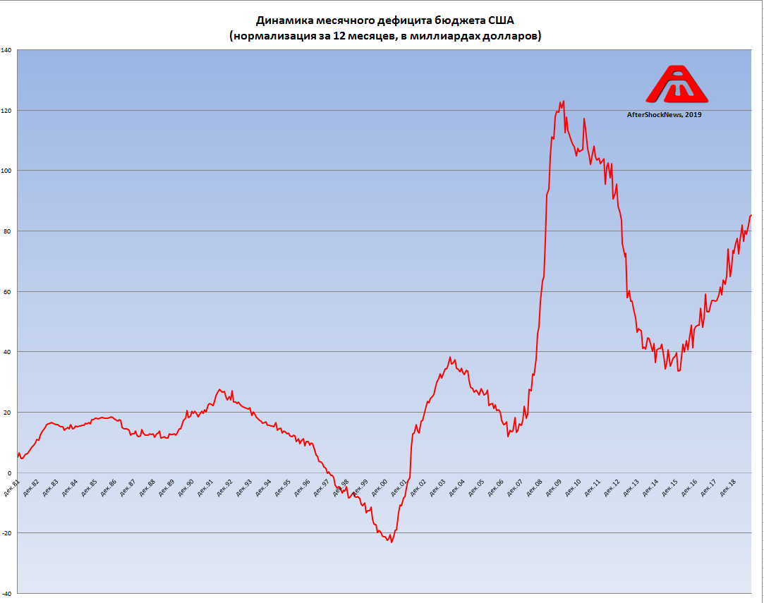 8. Месячный дефицит бюджета США составил в среднем $85.2 ярдов, вырос за год на 15.8%. Это абсолютный рекорд с января 2013 года: