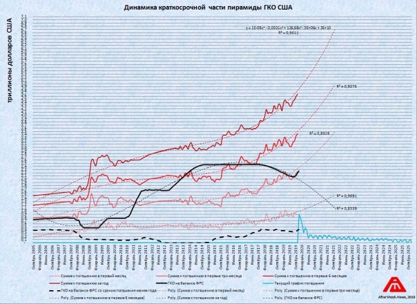 а) Оттенками красного - краткосрочная часть пирамиды ГКО США (к погашению в следующие 12 месяцев / 6 / 3 / ближайший месяц) в динамике