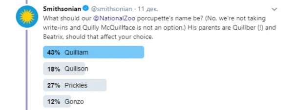 Его пол до сих пор не известен: у дикобразов половые органы скрыты, и специалисты ждут результатов анализа ДНК. Однако уже сейчас малыш получил имя – Куиллиам (Quilliam). Оно победило в ходе голосования, которое зоопарк проводил в соцсетях.