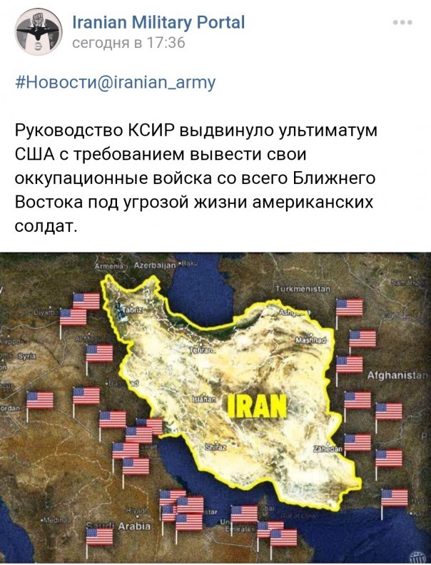Согласно данным информационных источников, Иран начал осуществлять подготовку к пуску баллистических ракет. Об этом свидетельствует аномальная активность на пусковых площадках, а также нахождение в воздушном пространстве страны большого количества истребителей, что может свидетельствовать о том, что в течение ближайших 24 часов Иран может нанести масштабный удар по расположению американских военных баз и объектов на территории всего Ближнего Востока.