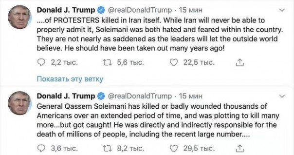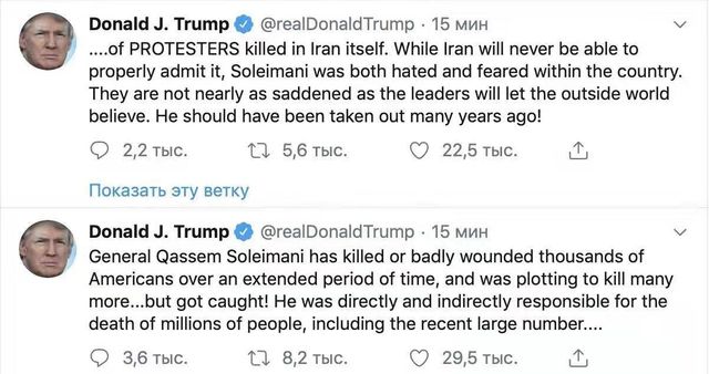 Мне, кстати, интересно, это когда Сулеймани «убивал американцев»? Когда организовывал операцию по спасению нашего лётчика? Или когда боролся с наркотрафиком из Афганистана? Можно слова Трампа занести в протокол обвинения, как признательные?
