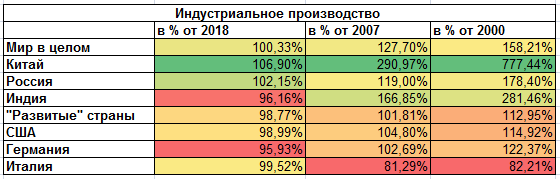 Если смотреть на более длинные интервалы, то видно, что Китай на первом месте везде и нарастил выпуск продукции более чем в семь раз (в сравнении с 2000 годом). Индия почти утроилась, в то время как "развитые страны" выдавили жалкие 12.95% за этот же период. Россия очень шустро шла в нулевых, потом серьезно замедлилась.