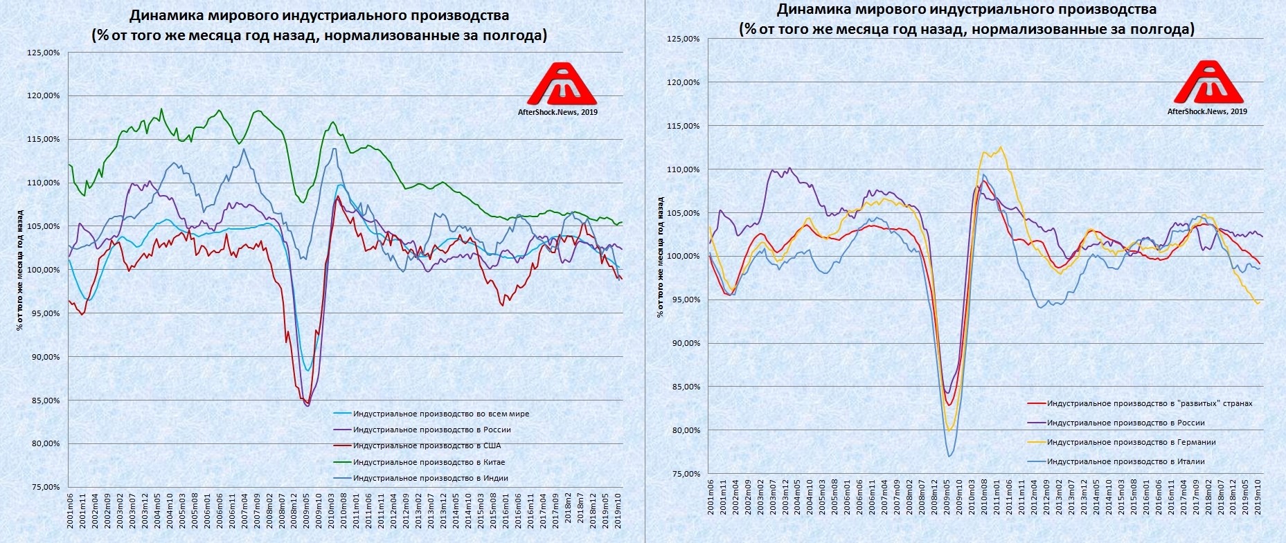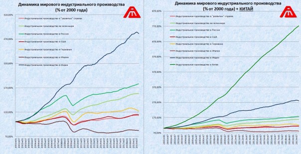 12. Индустриальное производство в процентах от уровня 2000 года (два графика отличаются исключительно наличием Китая и связанным с этим масштабированием):