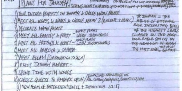 Как можно видеть из списка, террориста в посмертии интересовали куда больше вещи материальные, а не духовные. Первым пунктом значится инспекция дворца, который ему должны предоставить на том свете, а вторым — знакомство с гуриями и выбор из них двух любимых жён.