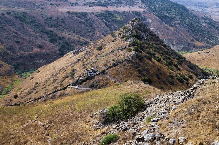 Современная фотография Гамалы, снятая с места расположения римских осадных позиций. В центре снимка хорошо виден участок восточной стены с пробитой брешью, вокруг которого во время осады разгорелись ожесточенные бои