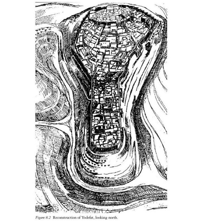 Иотапата была основана в IV – III веках до н.э. В описываемое время город имел площадь 4,8 га и полностью занимал вершину горного плато. Благодаря такому местоположению доступ к нему был возможен лишь с северной стороны, но и здесь по приказу Иосифа были возведены сильные укрепления. Их остатки, выявленные археологами во время раскопок 1992 – 2000 годах, говорят о том, что строительство проходило в большой спешке.