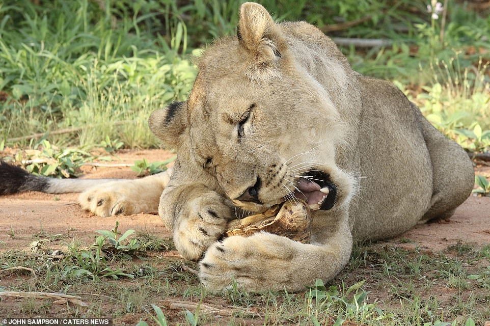 Гид предположил, что львица в конце концов устала и отпустила жертву, которая не стоит такого количества усилий: леопардовые черепахи в редких случаях могут весить более 20 кг (без панциря), но особь, попавшая на фото, значительно мельче.