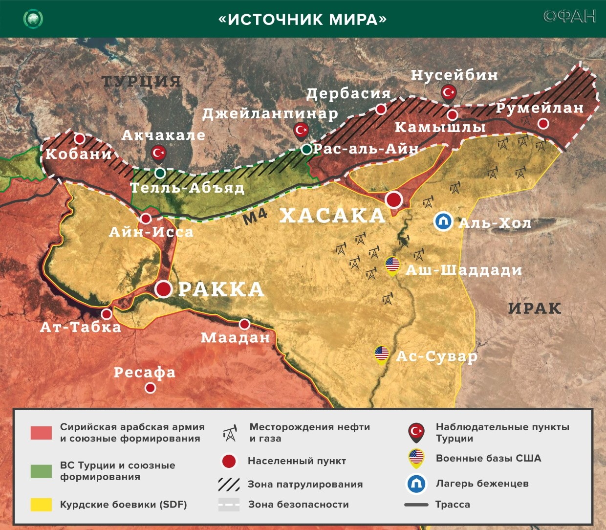 Стратегия турок — создание «зоны безопасности» вдоль своих южных рубежей — а сейчас оккупированные в ходе операции «Источник мира» территории фактически отрезаны от зоны, оккупированной в ходе операций «Оливковая ветвь» и «Щит Евфрата», — в районе Кассаба вольготно живут сирийские армяне, в Кобани грозят туркам ружьем злые боевики РПК, а в Камышлы против «султана-батюшки» злоумышляет коварное христианское ополчение, которое хлебом не корми, дай бахнуть по Нусайбину.