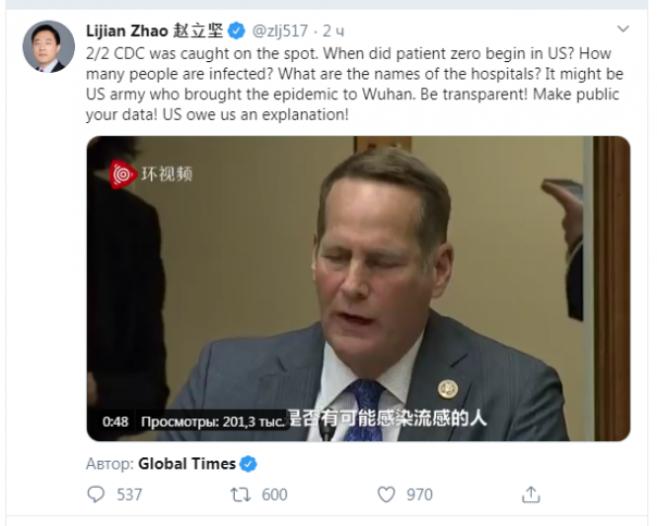 "Минздрав США официально признал, что некоторые из смертей, которые они ранее отнесли к гриппу реально были вызваны коронавирусом. По их официальным данным было 34 миллиона больных гриппом, из которых 20 тысяч умерли. Сообщите нам, будьте добры, сколько конкретно из них это реально коронавирус? Отчет CDC вызывает много вопросов. А когда конкретно был нулевой пациент в США? Сколько именно людей поражено коронавирусом в США? Не армия ли США занесла его в Китай и запустила эпидемию? Будьте прозрачными! Опубликуйте данные! США должны представить нам объяснения!"