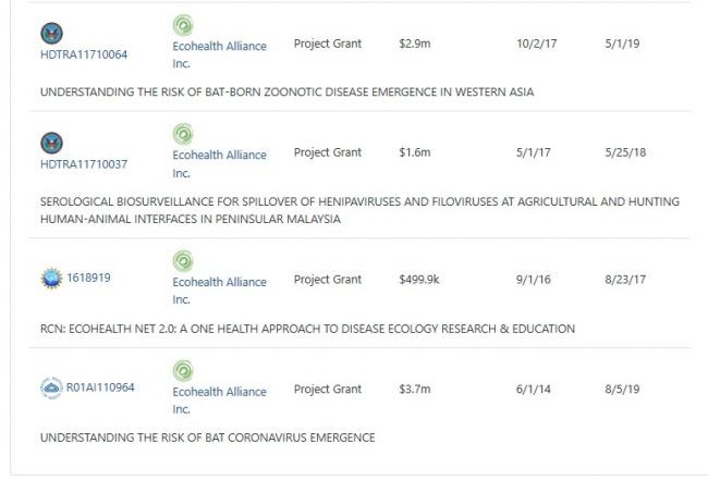В прошлом году закончился грант на $ 2,9 млн с DTRA на оценку риска появления заболеваний от летучих мышей в Западной Азии. Также в прошлом году специалисты EcoHealth Alliance должны были завершить работы по оценке риска появления коронавируса летучих мышей для Министерства внутренней безопасности США.
