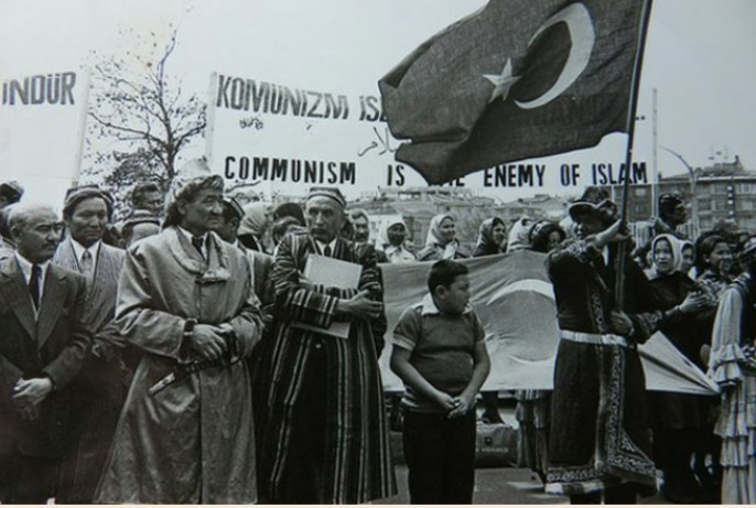 Альптекин (держит книгу), проводит демонстрацию в поддержку восточно-туркестанского сепаратизма в 1966 г. Альптекин стоит перед плакатом с надписью: "Коммунизм - враг ислама".