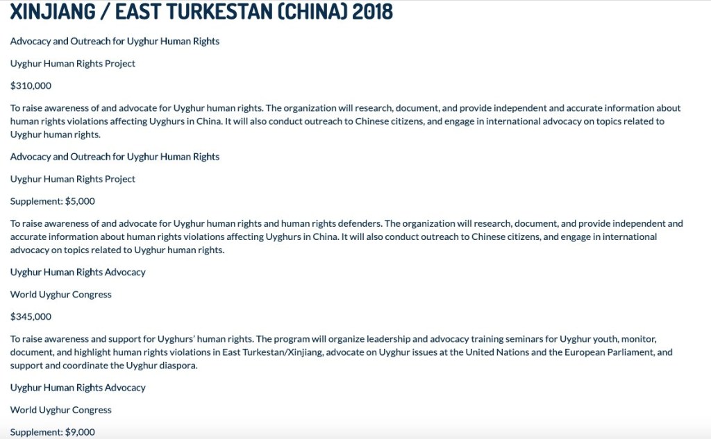 Основным проектом, вышедшим из UAA и NED, стал Уйгурский проект по правам человека (UHRP). UHRP был основан UAA в 2004 году с NED в качестве основного источника финансирования. NED предоставил UHRP колоссальные $1,244,698 в период между 2016 и 2019 годами.