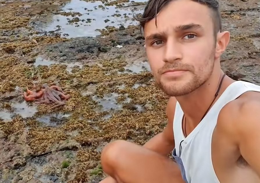 В один из дней он заметил на берегу у воды движение какого-то животного и сначала принял его за собаку, но подойдя ближе, тут же включил камеру. Оказалось, что по камням передвигался осьминог. Используя присоски на всех своих восьми конечностях, моллюск направлялся к водоему.