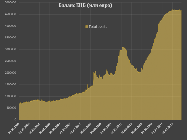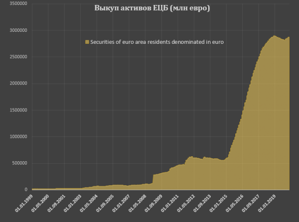 До этого они с середины 2015 по декабрь 2018 проводили масштабное QE с чистой инъекцией (покупки ценных бумаг по программе QE минус сокращение прочих ценных бумаг) около 2.3 трлн евро.