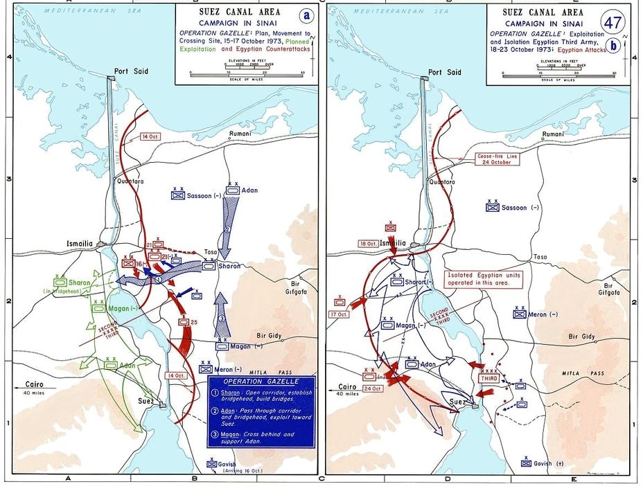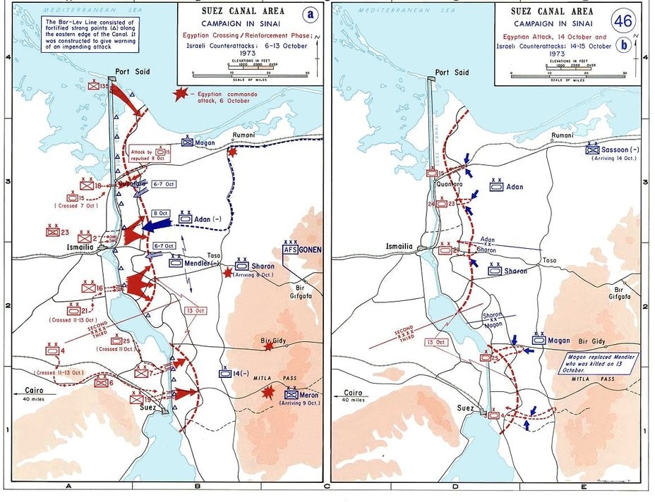7-го и 8-го октября на Синайский участок фронта прибыли две резервные израильские танковые дивизии: 162-я под командованием генерал-майора Авраама Адана и 143-я генерал-майора Ариеля Шарона. Резервные соединения в течение трех дней предпринимали контратаки, но изменить обстановку на фронте пока еще не могли.