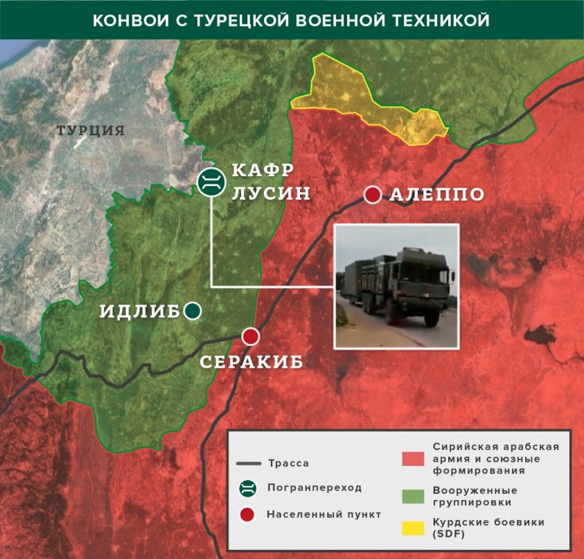 Несмотря на тот факт, что поставки турецкого вооружения происходят буквально на регулярной основе, после пересечения погранпункта «Кафр Лусин» информация о том, где оказывается новая бронетехника, не поступает. Из этого можно сделать вывод, что поставляемое Анкарой вооружение оседает в руках действующих в Большом Идлибе протурецких вооруженных группировок, в том числе входящих в «Сирийскую национальную армию» (СНА), а также и у признанных на международном уровне террористов.