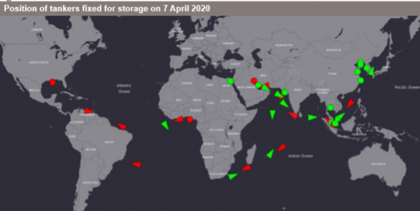 Эксперты по судоходству сообщили агентству Reuters, что число арендованных супертанкеров быстро возросло с 25 в марте до 40 в начале апреля. На середину апреля уже 60 супертанкеров были зафрахтованы для хранения нефти, в основном у берегов Сингапура и на побережье Мексиканского залива США, а также более мелкие танкеры.