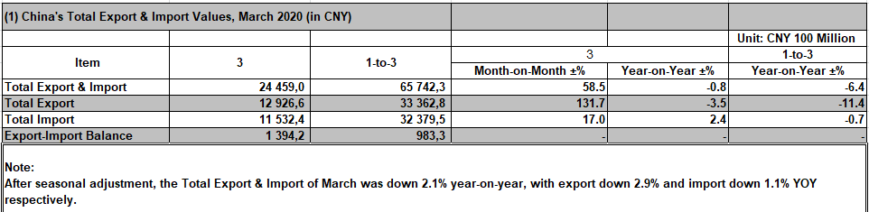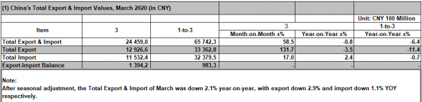 Таможенное управление КНР разместило отчёт за первый – "вирусный" – квартал 2020 года. Объем внешней торговли Китая в первом квартале достиг 6,57 трлн юаней, снизившись на 6,4% в годовом исчислении (аналогично далее). Экспорт сократился на 11,4% до 3,33 трлн юаней, а импорт – на 0,7% до 3,24 трлн юаней. Положительное сальдо торгового баланса сократилось на 80,6% и составило 98,33 млрд юаней.