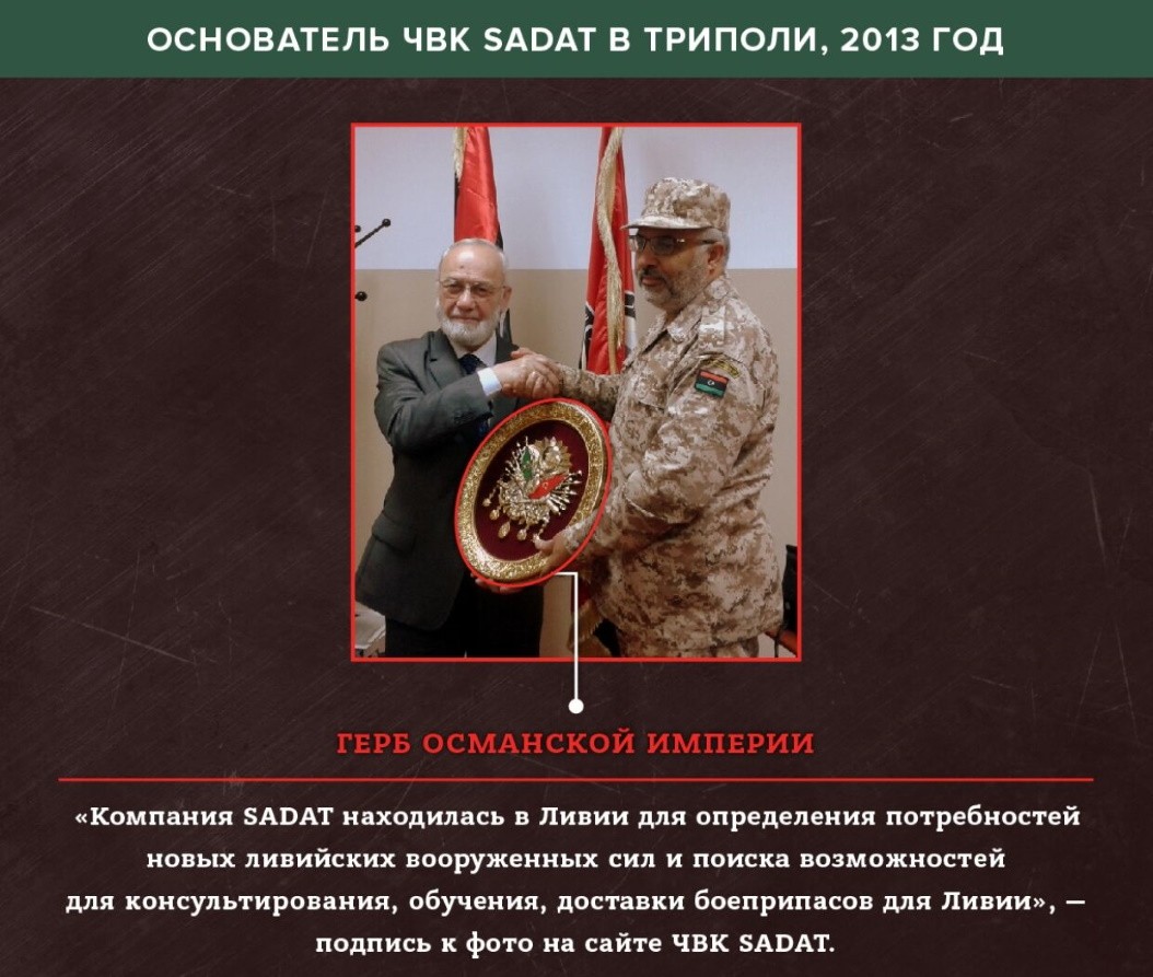 Важно знать, что SADAT присутствовал в Ливии задолго до подписания соглашения между ПНС и правительством Турции. Об этом имеется информация на сайте самого SADATа, а в интервью 2018 года для газеты HaberTür основатель организации, не скрывая, заявил о том, что сотрудники ЧВК SADAT впервые прибыли в Ливию еще в первой половине 2013 года.