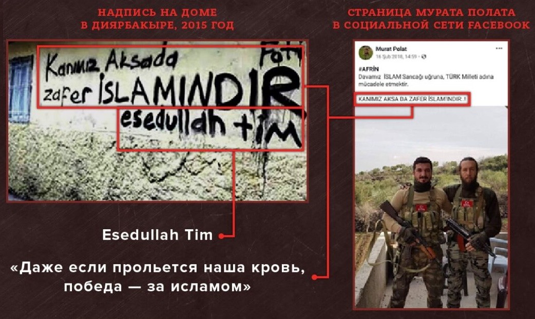 Есть еще одна важная деталь, указывающая, на то, что Полат стал наемником ЧВК SADAT Тулумба Мурат регулярно подписывал свои фотографии в социальных сетях уже знакомым нам лозунгом Esedullah: «Даже если прольется наша кровь, победа — за исламом».