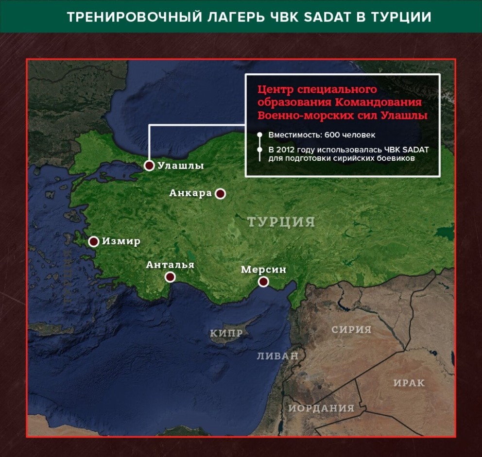 А турецкая газета Aydınlık в 2012 году опубликовала статью о том, что SADAT использует бывшую военную базу на северо-западе Турции в качестве лагеря для обучения сирийских боевиков, воевавших против официального Дамаска.
