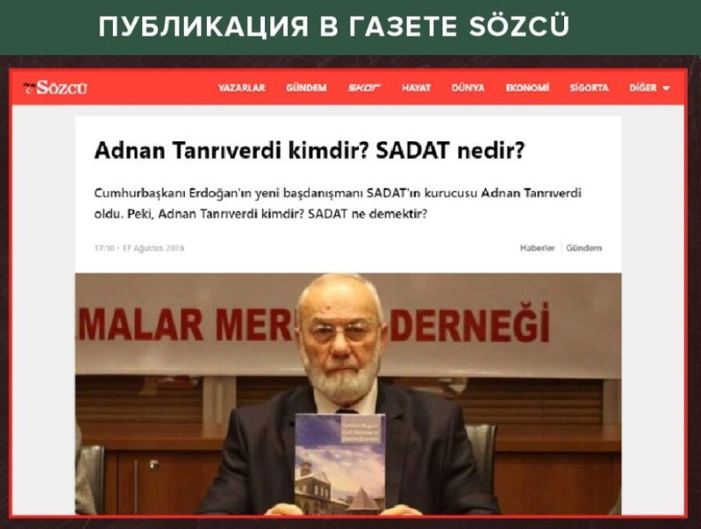 А самого основателя SADAT, бывшего бригадного генерала турецкой армии Аднана Танрыверди называют фигурой, имеющей сильное влияние на президента Турции, через которого он пытается воплотить свое виденье мирового порядка.
